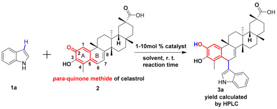 Celastrol (0.045 mmol, 20 mg), indole (0.045–0.090 mmol) was dissolved by 1 mL solvent in a 10 mL closed tube. After intensive stirring at room temperature, the solution was added with metal catalyst (1–10 mmol %) and the reaction was kept for 3 h. Without any postprocessing, the mixture was diluted with acetonitrile in a 25 mL volumetric flask. The yield of product was immediately determined by HPLC (see Scheme 5). HPLC spectra can be found in Figures S8–S31.
