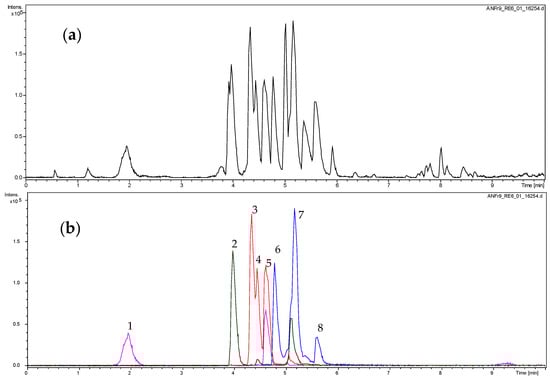 UHPLC/+ESI QqTOF MS (Ultra-high performance liquid chromatography positive electrospray ionization quadrupole/time-of-flight mass spectrometer) analysis of Fraction 9. (a): base peak chromatogram (m/z 100 to 1000); (b): extracted ion chromatograms for m/z 443 (blue), 291 (green), 458 (red), 307 (magenta). For peak assignment, see Figure 3.