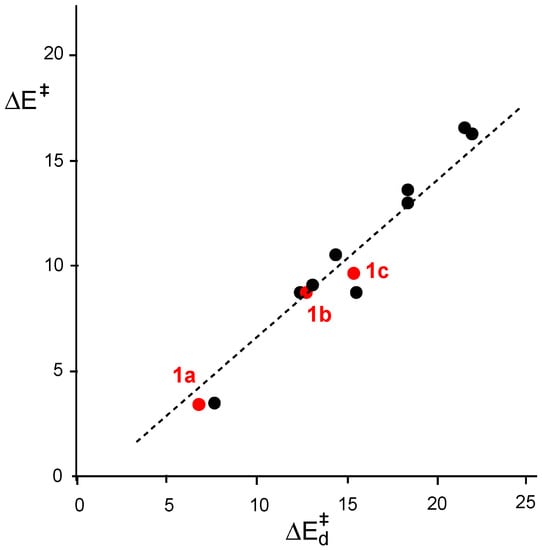 Houk found that the computed B3LYP/6-31G(d) activation enthalpies correlated very nicely with the distortion energies: ∆E≠ = 0.74 × − 0.78 kcal·mol−1 (R2 = 0.97) (see Figure 1). He concluded that the distortion energy of the reagents towards the transition state structure (TS) is the major factor controlling the reactivity differences of TACs. This finding, which can be considered a computational assertion of Hammond’s postulate established in 1955 [9], does not resolve the question why activation energies depend on geometries, which are the result of the distribution of the molecular electron density. In addition, the partition of the TS geometries into two separated fragments has no physical significance within Density Functional Theory [10] (DFT), since in this quantum chemical theory the energy is a functional of the electron density and the external potential, i.e., the nuclei positions. Consequently, the energy of the two separated fragments cannot be correlated with the energy of the TS because each of them loses the external potential created by the other fragment [11].