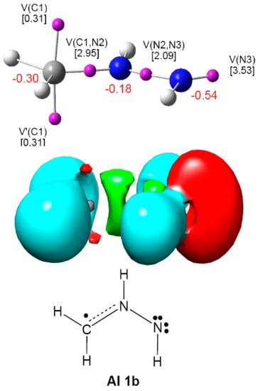 ELF topological analysis of the simplest AI 1b shows the presence of two monosynaptic basins, V(C1) and V’(C1), integrating a total electron density of 0.62 e, two disynaptic basins, V(C1,N2) and V(N2,N3), with electron populations of 2.95 e and 2.09 e, and one V(N3) monosynaptic basin integrating 3.53 e. These ELF basins are related with the presence of a C1 pseudoradical centre, a C1–N2 bonding region integrating ca. 3 e, an N2–N3 single bond and an N3 non-bonding electron density (see the ELF-based Lewis structure of AI 1b in Figure 2).