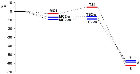 Due to the non-symmetry of AI 1b and DCE 6, this 32CA reaction can take place through two regioisomeric channels, the ortho and the meta (see Scheme 7), i.e., those associated with the initial formation of the C1–C4 and N3–C4 single bonds, respectively. A search for the stationary points involved in the two regioisomeric pathways allowed finding two MCs, MC2-o and MC2-m, two regioisomeric TSs, TS2-o and TS2-m, and the corresponding pyrazolidines 7 and 8, which were properly characterised; consequently, the 32CA reaction takes place through a one-step mechanism (see Scheme 7). The MPWB1K/6-311G(d) total and relative energies of the stationary points involved in the 32CA reaction of AI 1b with DCE 6 are given in Table S2 of the Supplementary Materials and Scheme 7, respectively, while the energy profile is graphically represented in blue in Figure 4.