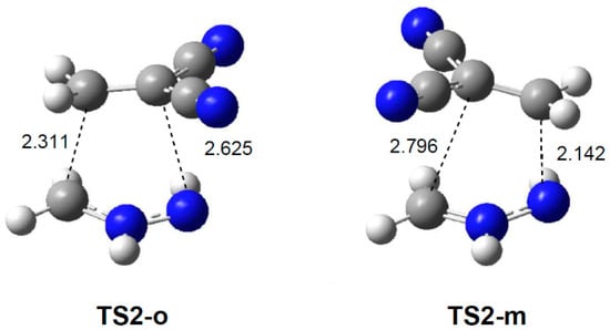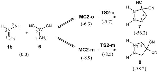 When AI 1b and DCE 6 gradually approach each other, the energy is reduced until the formation of two MCs located 6.3 (MC2-o) and 8.9 (MC2-m) kcal·mol−1 below the separated reagents takes place (see Figure 4). Further approach of both the AI and the DCE frameworks leads to the formation of the TSs, which are found 3.2 (TS2-o) and 0.4 (TS2-m) kcal·mol−1 above the more stable MC2-m. Note that both MCs are in thermodynamic equilibrium. Moreover, formation of pyrazolidines 7 and 8 from MC2-m becomes strongly exothermic by 47.3 and 49.3 kcal·mol−1, respectively. Some appealing conclusions can be drawn from these energy results: (i) the activation barrier associated to the more favourable TS2-m is 8.3 kcal·mol−1 lower than that associated to TS1, 8.7 kcal·mol−1; (ii) this 32CA reaction is highly regioselective, TS2-o being 2.8 kcal·mol−1 above TS2-m; and (iii) the strong exothermic character of this reaction makes the formation of pyrazolidines 7 and 8 irreversible.