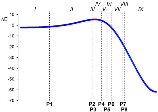 The nine phases, separated by black dashed lines, in which the IRC (in amu1/2·Bohr) associated with the non-polar 32CA reaction between AI 1b and ethylene 3 is topologically divided. Relative energy variations, ΔE, with respect to the separated reagents, are given in kcal·mol−1. The red point indicates the position of TS1.