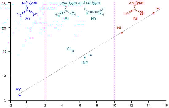 As has been aforementioned in the Introduction, a good correlation between the electronic structures of TACs and the activation energies involved in the non-polar 32CA reactions towards ethylene 3, i.e., their reactivity, has been found [16,17]. Thus, while zwitterionic TACs such as Ni 1c, which must break the C–N double bond before the creation of the carbon pseudoradical centre demanded for the subsequent C–C bond formation, present high activation energies towards ethylene 3 (14.3 kcal·mol−1 for the reaction of Ni 1c with ethylene 3), pseudodiradical TACs such as AY 1a, which already has the two required carbon pseudoradical centres in the structure, present unappreciable activation energies (1.0 kcal·mol−1 for the reaction of AY 1a with ethylene 3). Note that AY 1a and Ni 1c are located at the extremes of the series given in Figure 10.