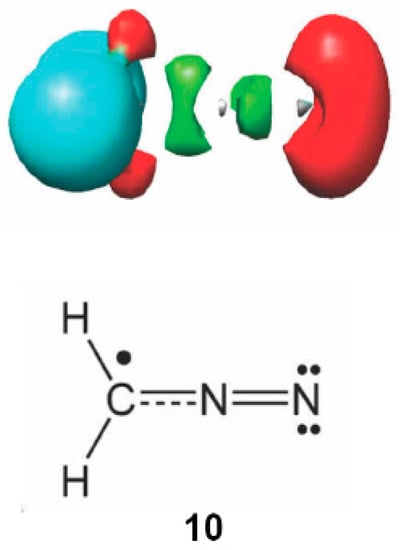 Very recently, the 32CA reactions of diazoalkanes (DAAs) with ED ethylenes have been studied [36]. ELF topological analysis of the simplest DAA 2c showed that, similar to AI 1b, this TAC also has a pseudoradical structure (see Figure 11) [36]. However, despite its pseudoradical structure, the 32CA reaction of DAA 2c with ethylene 3 presents a high activation energy, 16.6 kcal·mol−1, as a consequence of its lineal P-TAC structure [19].