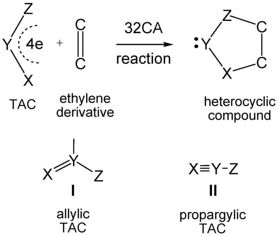 [3+2] cycloaddition (32CA) reactions emerged as a powerful synthetic tool for the construction of five-membered heterocyclic compounds [1,2]. Although these reactions have been experimentally known since the end of the 19th century, it was Huisgen who, in 1961, defined them as “1,3-dipolar cycloadditions” [3,4]. These reactions are bimolecular in nature and involve the 1,3-addition of an ethylene derivative to a three-atom-component (TAC) (see Scheme 1). TACs can be structurally classified into two categories: allylic type (A-TAC) and propargylic type (P-TAC) structures [5,6]. While A-TACs such as I are bent, P-TACs such as II have a linear structure (see Scheme 1).
