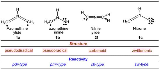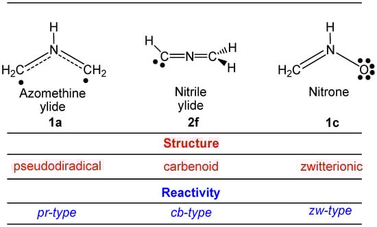 Several MEDT studies devoted to understanding the reactivity of TACs participating in 32CA reactions have allowed establishing a very good correlation between their electronic structures and reactivities. Accordingly, depending on the electronic structure of the TAC, i.e., pseudodiradical (typically an azomethine ylide (AY) 1a) [14], carbenoid (typically a nitrile ylide 2f) [15] or zwitterionic (typically a nitrone (Ni) 1c), the 32CA reactions towards ethylene 3 have been classified into pseudodiradical-type (pr-type) [16], carbenoid-type (cb-type) [17] and zwitterionic-type (zw-type) [16] reactions (Scheme 3). The reactivity trend decreases in the order pseudodiradical > carbenoid > zwitterionic, in such a manner that while pr-type 32CA reactions take place easily through earlier TSs even with a very low polar character [16,18], zw-type 32CA reactions demand the adequate nucleophilic/electrophilic activations to take place [16,17,19]. Note that the feasibility of the three reactivity types depends on the polar character of the reaction, i.e., the nucleophilic/electrophilic interactions taking place at the TSs; the more polar the reaction, the faster the reaction.