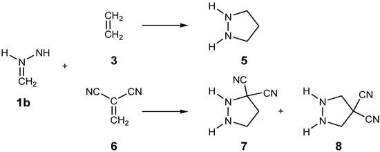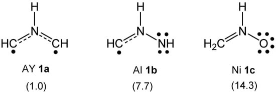 AY 1a, azomethine imine (AI) 1b and Ni 1c constitute a series of three CH2=NH–X (X = CH2, NH, O) A-TACs in which the terminal X atom changes along the C, N, and O elements of the second arrow (see Scheme 4). In this short series of TACs, the activation energy associated with the 32CA reactions with ethylene 3 increases as the electronegativity of the atom X increases in the following order C < N < O (see Scheme 4) [16]. Interestingly, while the simplest AY 1a has a pseudodiradical structure, [14] Ni 1c has a zwitterionic one [20] (see Scheme 3). This behaviour causes these TACs to have a different reactivity towards ethylene 3 in 32CA reactions, i.e., the 32CA reaction involving AY 1a is a pr-type reaction presenting a very low activation energy, 1.0 kcal·mol−1, while that involving Ni 1c is a zw-type reaction with a high activation energy of 14.3 kcal·mol−1 (see Scheme 4). Note that it is expected that the reactivity of AI 1b, which presents an activation energy towards ethylene 3 of 7.7 kcal·mol−1, will be different to that of AY 1a and Ni 1c.