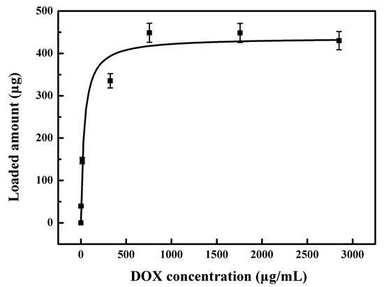 The DOX loading was recorded at a given nanocarrier content while varying the DOX concentrations from 0 to 5000 μg/mL. The DOX loading amount increased gradually as the DOX concentration increased, and a maximum loading of 43.7% was achieved (Figure 2). The DOX molecules can be adsorbed onto the surface of the Eu-FA nanorods. DOX is a small molecule and can thus possibly be incorporated within the mesoporous or the hollow space. The high surface-to-volume ratio and the unique crystal structure make the Eu-FA nanorods easy to absorb DOX molecules. In addition, DOX has a pKa of 8.3 and is positively charged at a pH of 7.4. Therefore, DOX is attracted to the negatively charged nanocarriers without additional surface functionalization [15]. As DOX is oppositely charged to the Eu-FA surface and is small in size, its incorporation into the mesoporous should be easy, and even penetration into the hollow space of the nanorods should be possible [16].