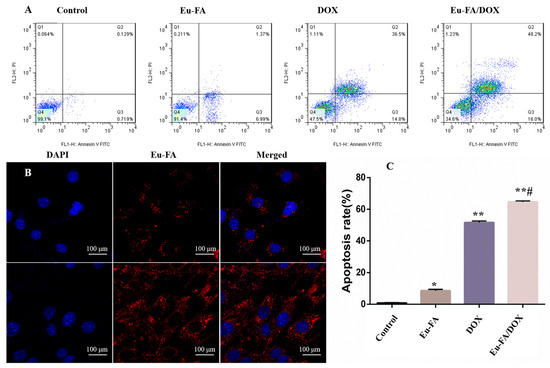 (A) Flow cytometry results for apoptosis after the A375 cells were treated with the control, Eu-FA (40 μg/mL), DOX (17.48 μg/mL) and Eu-FA/DOX (40 μg/mL Eu-FA full loading with DOX); (B) Blue fluorescence from DAPI and red fluorescence from Eu-FA were observed in the cytoplasm or within the nucleus; (C) Statistical results of apoptosis in each group (*# means p < 0.05, ** means p < 0.01).