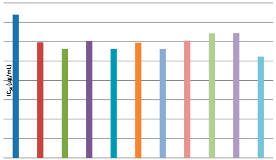 The antioxidant capacity of compounds 4a–4k was evaluated by the method of Wang et al. 52(1998) [52]. The absorbance was measured at 517 nm against a blank, i.e., without DPPH. All tests were run in triplicate and an average was used. Decrease of DPPH solution absorbance indicates an increase of DPPH radical scavenging activity. The amount of sample necessary to decrease the absorbance of DPPH by 50% (IC50) was calculated graphically and the percentage inhibition was calculated according to the equation:
