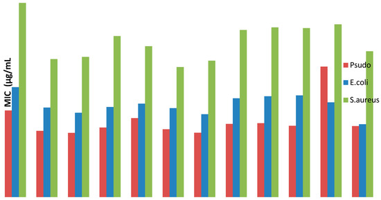 The in vitro antibacterial activity of compounds (4a–4j), expressed as an MIC value, was assessed by the serial dilution methods against Escherichia coli, Staphylococcus aureus, Pseudomonas aeruginosa and two standard antibiotics (amoxicillin and ciprofloxacin) (Figure 2). The MICs of the synthesis compounds were within concentration ranges of 50–153 μg/mL. The entire synthesized compounds and standard antibiotics had higher antibacterial activity against bacteria strains and are most active against Gram-negative bacteria than the Gram-positive bacteria. In general, all compounds are, approximately, behaving as the reference compounds with same activities. This potent antibacterial activity exhibited may be due to the thiazole ring. However, we observed that both electron donating as well as electron withdrawing groups were found to increase the antibacterial properties. Compounds 4b, 4c, 4f and 4g displayed moderate antibacterial activity whereas the remaining compounds showed less activity.