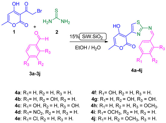 A mixture of 3-(bromoacetyl)-4-hydroxy-6-methyl-2H-pyran-2-one ) ((1) (1 mmol), thiourea (2) (1 mmol), benzaldehyde (3a–3j) (1 mmol) and SiW.SiO2(15%) [36] was refluxed in ethanol/water 1/1 (5 mL) with stirring for 2 h to 3.5 h at 65 °C or under ultrasonic activation for 1.5 h to 2 h at room temperature (Table 2).The obtained solid was filtered off and washed with ethanol; the remaining solid was dissolved in acetone and SiW.SiO2 was removed by filtration. The filtrated solution was evaporated under vacuum and the resulting product oven-dried (60 °C).