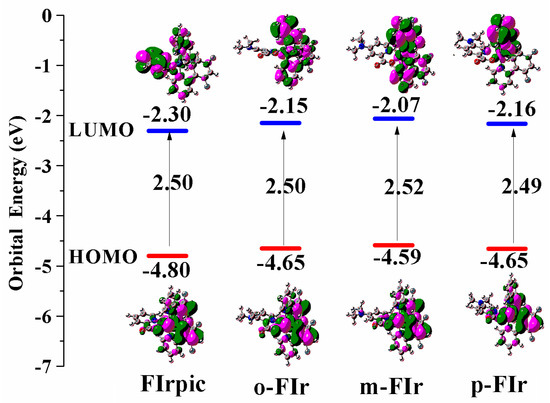 Normally, when the interfacial vacuum energy shift can be neglected, the hole (or electron) injection energy barrier from the electrode to semiconductor (Φh) (or Φe) can be calculated by Φh = |HOMO| − Φm (or Φe = Φm − |LUMO|), where Φm is the work function of the electrode [22]. Consider that Au (Φm = 5.1 eV) is widely used as electrode in OLEDs; therefore, it is used as reference electrode [22]. As depicted in Figure 3, the HOMO and LUMO energies of o-FIr, p-FIr, and m-FIr increase remarkably (−4.65 eV and −2.15 eV for o-FIr, −4.59 eV and −2.07 eV for m-FIr, −4.65 eV and −2.16 eV for p-FIr) compared with FIrpic (−4.80 eV and −2.30 eV). Therefore, the calculated Φh of these complexes are (in the region of 0.30–0.51 eV) much smaller than those of the calculated Φh values (in the region of 2.80–3.03 eV). It is obvious that these emitters are suitable for use as p-type organic semiconductors [23]. Furthermore, the HOMO energy level of o-FIr (0.15 eV), m-FIr (0.21 eV), and p-FIr (0.15 eV) is significantly higher than that of FIrpic. The higher HOMO energies will benefit the hole injection abilities. Together with the increasing HOMO and LUMO energy, the HOMO–LUMO energy gaps of our designed molecules are similar to that of FIrpic, which means that absorption and phosphorescent spectra of these designed complexes might be similar to that of FIrpic when these spectra are predominantly contributed by the HOMO→LUMO transition.