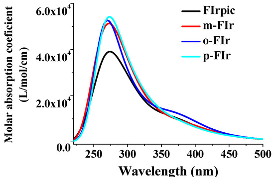 For FIrpic, o-FIr, p-FIr, and m-FIr, the electron densities of HOMOs are mainly located on 50% d(Ir) orbital and 38% π(C∧N ligands) orbital, as shown in Figure 3 and Table S2. Owing to the introduction of N(CH3)2 groups, the LUMOs in o-FIr, m-FIr, and p-FIr are mainly focused on the C∧N ligands with about 90% compositions, while the LUMO in FIrpic is contributed by N∧O ligand. The HOMO-1 of these studied complexes is mainly focused on the ca. 50% d orbital the ca. 30% π orbitals of N∧O ligand, while theirs HOMO-2 are mainly contributed by N∧O ligand. The contributions of d(Ir) orbital on HOMO-3 of o-FIr (67.5%) and m-FIr (56.9%) are similar to that of FIrpic (67.1%). This means that the N(CH3)2 substitutions have a minor effect on the composition of the frontier molecular orbital. Therefore, the nature of electron transition upon excitations of o-FIr, p-FIr, and m-FIr might be similar with those of FIrpic, which will be further investigated in the following section.