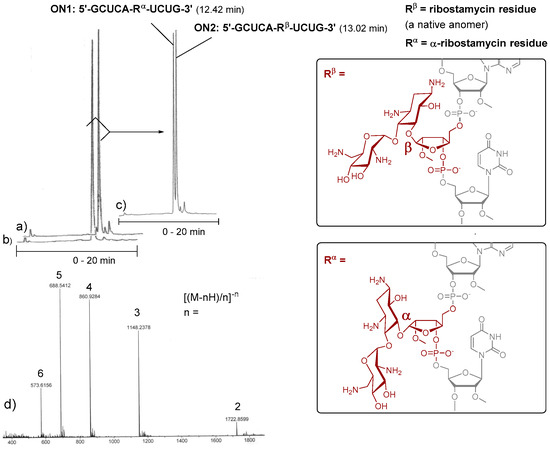 To evaluate the applicability of 3 and 4 in the automated chain assembly, intra-chain fusions of the ribostamycins and a random 2′-O-methyl RNA sequence (5′-GCUCA-R-UCUG-3′, ON1: R = α-ribostamycin residue (Rα) and ON2: R = ribostamycin residue (Rβ)) were first synthesized (Figure 2). The coupling efficiency was evaluated by DMTr-assay. A double phosphoramidite coupling using 0.1 mol L−1 3 and 4 in acetonitrile, benzylthiotetrazol as an activator and a 600 s coupling time (2 × 600 s), followed by the standard oxidation step, gave ca. 95% coupling yield for both building blocks. Otherwise, the oligonucleotides were assembled using the standard RNA coupling cycle (a 300 s coupling time used for the 2′-O-methyl nucleoside building blocks). After the chain assembly, the levulinoyl groups of the ribostamycin moieties were removed on support with a mixture of hydrazinium acetate (NH2NH2·OH2, pyridine, AcOH, 0.124/4/1, v/v/v, 2 × 10 min at 25 °C), and the supports were then subjected to concentrated ammonia (overnight at 55 °C) [17]. The released ON1 and ON2 were analysed by ion exchange HPLC. As seen in the HPLC profiles of the crude products (Figure 2a,b), the automated synthesis could be successfully carried out. Interestingly, the chiral integrity of the ribostamycin moieties also affects the retention times of the conjugates in the HPLC profiles (Figure 2c).