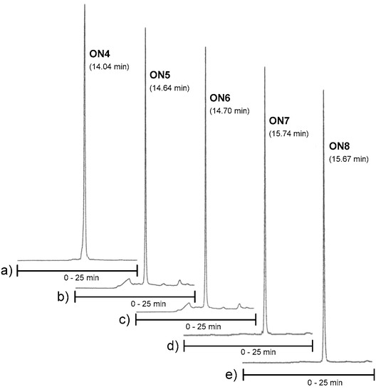 RP HPLC profiles of ON4–ON6. Conditions: An analytical RP HPLC column (C18, 250 × 5 mm, 5 µm), flow rate: 1.0 mL min−1, detection at 260 nm, a gradient elution (0–25 min) from 0 to 50% acetonitrile in 0.1 mol L−1 aqueous triethylammonium acetate.