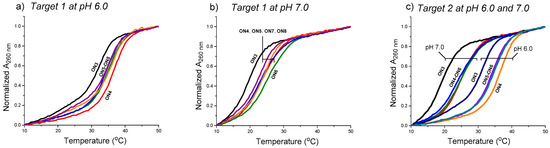 UV-melting profiles of the triple helical constructs (the duplex melting range, Tm = 65 °C excluded). Conditions: 2.0 each oligonucleotide (Target 1 or 2 + ON3–ON8, cf. Figure 3), 10 mmol L−1 sodium cacodylate, pH 6.0 (a,c) and pH 7.0 (b,c), 0.1 mol L−1 NaCl, 0.2 °C/min, detection at 260 nm.