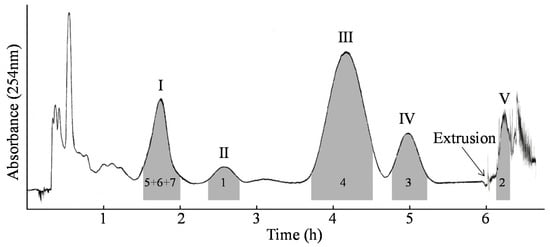 The purchased total flavonoids from the leaves of C. pinnatifida were first purified under chloroform/methanol/water/n-butanol (4:3:2:1.5, v/v). The total separation time of HSCCC was about 7 h with the stationary phase of 62.8%. Based on HPLC analysis of Figure 2, four pure compounds of peak II (1, 8.9 mg), peak III (4, 47.3 mg), peak IV (3, 18.2 mg), and peak V (2, 10.3 mg) were obtained, with purities over 98%, respectively, as determined by HPLC. Also, a mixture (25.9 mg) of peak I was obtained which was composed of 5–7.