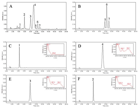 HPLC chromatograms of HSCCC fractions. (A: purchased total flavonoids; B: peak I in Figure 2; C: peak II in Figure 2; D: peak III in Figure 2; E: peak IV in Figure 2; F: peak V in Figure 2.) Experimental conditions: a Waters XBridge BEH C18 column (100 mm × 4.6 mm i.d., 2.5 μm); Flow rate: 1.0 mL/min; Column temperature: 25 °C; Injection volume: 10 μL; Detection: 254 nm. HPLC conditions are as follows: acetonitrile (A) and water (B), the gradient elution mode was set as follows: 0–3 min, 13–14% A; 3–15 min, 14–17% A; 15–15.1 min, 17–13% A; 15.1–20 min, 13% A.