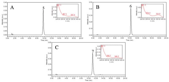 The peaks I-V isolated by HSCCC were analyzed by HPLC (Figure 3). Peak I containing compounds 5–7 were further purified by pre-HPLC with a solvent of acetonitrile–water (19:81, v/v). The flow-rate was set at 3.0 mL/min with a wavelength of 254 nm. Finally, three compounds were obtained with 4.6 mg of vitexin, 11.7 mg of hyperoside, and 9.2 mg of isoquercitrin, with the purities over 98%, respectively, as determined by HPLC (Figure 4).