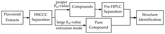 In the present study, an efficient method combining HSCCC and pre-HPLC was used to preparative separate flavonoids from the leaves of C. pinnatifida (Figure 5). In HSCCC separation, a solvent system of chloroform/methanol/water/n-butanol (4:3:2:1.5, v/v) was used to isolate the total flavonoids. n-Butanol was used to adjust the KD-values. For the compound with the largest KD-value, an extrusion mode was used ensure rapid separation. Pre-HPLC was then applied to separate compounds with close KD-values. Finally, seven compounds with high purities were obtained with the established method. The proposed method proved to be efficient to separate compounds with broad KD-values and similar polarities. This developed methodology could be applied to rapidly separate pure compounds in further research on C. pinnatifida and its flavonoids. It also could be used to obtain compounds for biological studies.