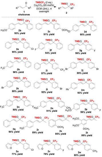 With the optimized reaction conditions in hand (Table 2, entry 1), we further examined the scope of the reaction, and the experimental results are summarized in Scheme 2 and Scheme 3, respectively. In the first part, we demonstrated the general applicability of the Cs2CO3 catalyst in the trifluoromethylation of more than 22 different chalcones (Scheme 2). The results showed that chalcones, including alkyl, aryl, halogen or other substituents on the phenyl moiety showed good to excellent conversion, affording the corresponding trifluoromethylated silyl ethers in high yields (Scheme 2). Moreover, heterocylic enones and alkyl enones were also suitable substrates in this reaction (Scheme 3).