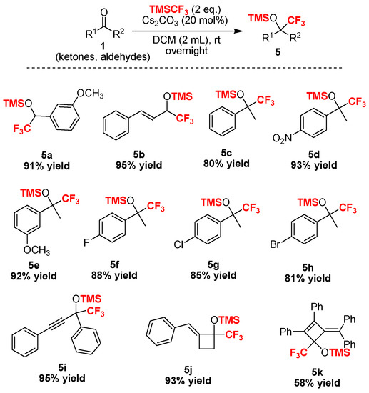 The challenge to generate organofluorine molecules featuring a trifluoromethyl motif at a carbon center has increasingly stimulated high interest both in academic and chemical industry research [1,2]. In the past decades, trifluoromethylated compounds have received much attention because of their significant applications as important synthons, biologically active agents, and functional materials that exhibit specific and unique biological and physical features [3,4,5,6,7,8]. Recent reports on the direct introduction of a trifluoromethyl group by electrophilic, nucleophilic, or radical processes have revealed the equally challenging approach of exploiting prochiral trifluoromethylated substrates [4,9,10,11,12,13,14,15,16,17,18,19,20]. In addition, the chemoselective construction of trifluomethylated tertiary alcohols is undoubtedly one of the most fundamental topics in organofluorine chemistry and remains a highly useful process in organic transformations. For this purpose, a direct trifluoromethylation of carbonyl compounds, such as ketones, could be easily completed by nucleophilic addition of TMSCF3 to give trifluomethylated alcohols in the presence of a fluoride catalyst or other Lewis bases, including phosphines, amines, TBD, sodium or lithium acetates, etc., which mediate the silicon-carbon cleavage of TMSCF3 [21,22,23,24,25,26,27,28,29,30,31,32,33,34,35,36,37,38,39,40,41,42,43,44,45,46,47]. Notably, since the first report of Prakash and Olah [23] concerning the trifluoromethylation of benzaldehyde to give organofluorine compounds bearing secondary hydroxyl groups in the presence of fluoride ion reagent there has been a lot of effort devoted to the development of this type of trifluoromethylation reaction, including asymmetric versions of such transformations [22,23,24,25,26,27,28,29,30,31,32,33,34,35]. In this regard, despite the fact that there are several successful synthetic methods in the case of the trifluoromethlytion reactions with TMSCF3, the introduction of commercially available, simple and cheap bases as catalyst precursors for the establishment of a highly efficient and practical trifluomethylation reaction and corresponding one-pot synthesis of trifluoromethylated silyl ethers is still a highly desirable synthetic methodology target.