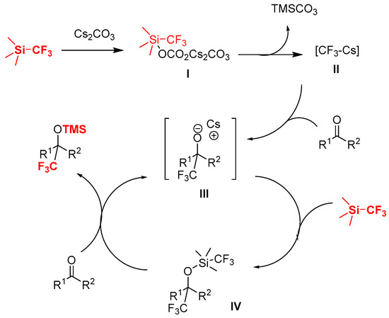 From a mechanistic standpoint, as shown in Scheme 4, it is reasonable to consider that the initiation by carbonate anion of Cs2CO3 leads to the formation of the possible hypervalent silicon complex [3,23,57,58,59,60,61,62] to give trifluoromethylated nucleophilic reagent II, which then reacted with the ketone to give the reactive, and more nucleophilic alkoxide III, and the reaction between III and TMSCF3 leads to the pentavalent complex IV, then IV readily gives the product through CF3 transfer and O-silylation in the presence of ketone with regeneration of the catalyst III.