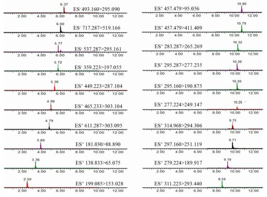 In this study, in order to obtain the best mass spectrometry conditions, standard solutions of all of the analytes were tested separately in direct infusion mode by the full-scan MS method in both positive and negative ionization modes. It was found out that flavonoids, tanshinones, and triterpenes had a stronger response in the positive ion mode compared to the negative ion mode. Nevertheless, the tested salvianolic acids showed sensitivity not only in positive mode but also in negative mode, rosmarinic acid, lithospermic acid, salvianolic acid B, and salvianolic acid A obtained from the negative ion mode were higher than that from the positive ion mode, while danshensu, protocatechuic aldehyde, and caffeic acid had better sensitivity and intensity in the positive ion mode, which made it accurate and easy to detect them with lower content levels in S. miltiorrhiza and identify each peak by confirming the molecular ions or quasi-molecular ions. Product ions were automatically chosen according to the stability and ion response by MS. The multiple reaction monitoring (MRM) transitions and parameters of 20 compounds applied in the study are listed in Table 1.