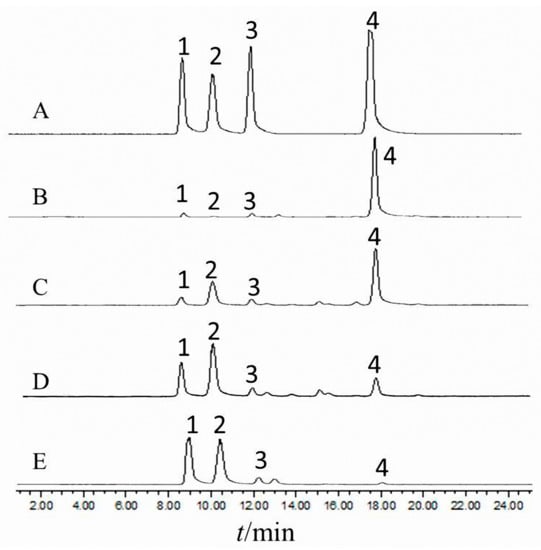HPLC-ELSD chromatogram of different parts in S. miltiorrhiza. (A) Mixed reference; (B) roots; (C) stems; (D) leaves; and (E) flowers; (1) fructose; (2) glucose; (3) sucrose; (4); stachyose.