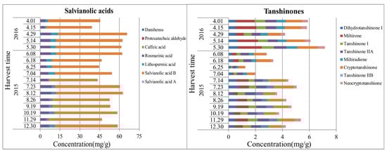 Dynamic accumulation of the contents of salvianolic acids and tanshinones in the roots of S. miltiorrhiza.