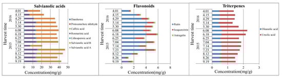 Dynamic accumulation of the contents of salvianolic acids, flavonoids, and triterpenes in the leaves of S. miltiorrhiza.