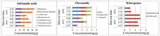 Analysis of the dynamic accumulation of chemical components in flowers of S. miltiorrhiza at different flowering stages is shown in Figure 7 and Table S5 indicates that the contents of phenolic acids and flavonoids reached the maximum value at the end of April (early bloom stage), while the triterpenes and monosaccharides (fructose and glucose) were high at the end of May to early June (full-bloom stage), and the disaccharide (sucrose) and oligosaccharide (stachyose) contents attained the highest levels at the middle to the end of June (late bloom stage). From what is mentioned above, we may come to the conclusion that chemical components of the aerial parts of S. miltiorrhiza were various and abundant, which can be taken into consideration as a new source of salvianolic acids and flavonoids. As a matter of fact, determination of the suitable harvest season of the aerial parts of S. miltiorrhiza should be evaluated according to the actual demand and, supposing salvianolic acid as the main evaluation index, we recommend July and August as the optimum harvest time of the aerial parts of S. miltiorrhiza.