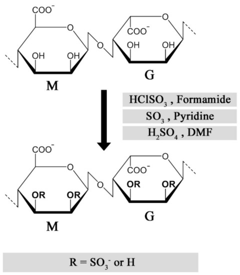 - Fan, L.H.; Jiang, L.; Xu, Y.M.; Zhou, Y.; Shen, Y.A.; Xie, W.G.; Long, Z.H.; Zhou, J.P. Synthesis and Anticoagulant Activity of Sodium Alginate Sulfates. Carbohydr. Polym. 2011, 83, 1797–1803. [Google Scholar] [CrossRef]