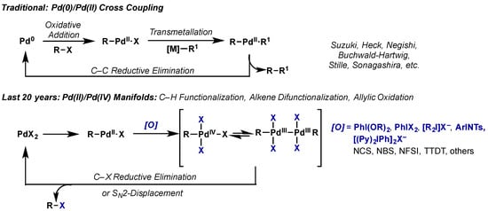 Manifolds for palladium catalysis. Traditional methods via Pd(0)/Pd(II) and recent advances in Pd(II)/Pd(IV) catalysis.