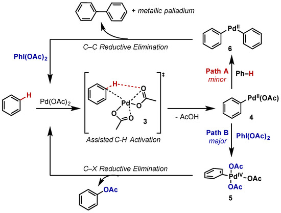 The first report of Pd-catalyzed C–H acetoxylation using a hypervalent iodine oxidant was by Crabtree, who achieved the acetoxylation of benzene using Pd(OAc)2 with PhI(OAc)2 as the external oxidant and –OAc source (Scheme 3) [10]. This built upon the work of Stock et al., which employed dichromate to perform an analogous transformation [11], however PhI(OAc)2 offered much higher selectivity and did not perform further product oxidations. In what has become a standard mechanistic proposal, Crabtree proposed acetyl assisted C–H activation at Pd(II) (intermediate 3) would give intermediate 4, which can then be diverted down one of two pathways. Along the desired pathway (Path B) 5 is then oxidized by PhI(OAc)2 to Pd(IV) species 5 with introduction of two acetyl groups. Subsequent reductive elimination gives rise to acetoxylated product and regeneration of the Pd(OAc)2. Importantly, Crabtree noted that competitive formation of biphenyl (via Path A) is minimized with PhI(OAc)2, indicating that oxidation to Pd(IV) in this system is significantly faster than a second C–H activation step to give 6. It was also found that in the absence of oxidant, biphenyl was the only observable product, thus indicating that Pd(II) intermediate 4 will not undergo direct C–X reductive elimination, and emphasizing the significance of Pd(IV) pathways in facilitating such transformations. While this system displayed only moderate catalytic activity and required solvent quantities of the arene, it laid the foundation for the development of directed C–H acetoxylation, which has relied on hypervalent iodine oxidants to efficiently acetoxylate C(sp2)–H as well as C(sp3)–H bonds.