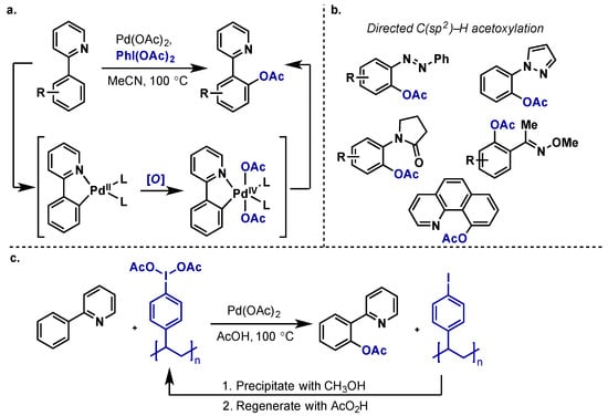 (a) First report on the directed C(sp2)–H acetoxylation of 2-phenylpyridine with Pd(OAc)2/PhI(OAc)2; (b) General scope of directing groups used for C(sp2)–H acetoxylation; (c) Polymer-supported λ3-iodane allows for facile oxidant recycling.