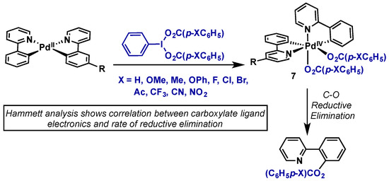 The Sanford group has conducted extensive mechanistic studies on these processes, and the reader is directed to some selected full reports for detailed discussion [2,18,19,20]. Their work has been accompanied by that of Ritter and others, with a key point being whether Pd(IV) species or Pd(III) dimers are the active catalysts. Key reports detailing the possibility of Pd(III) intermediates are discussed in more detail in Section 2.3. Sanford’s seminal report in this area outlines some of the key features of both the ligand scaffolds and hypervalent iodine oxidants that allow for study of reactive Pd(IV) intermediates as well as mechanistic elucidation (Scheme 6) [19]. Two rigid cyclometallated 2-phenylpyridine ligands were incorporated to lend stability to the resultant complexes, and suppress competing ligand exchange and side reactions upon oxidation. Additionally, the acetate ligands of PhI(OAc)2 were exchanged for aryl carboxylates that could be readily derivatized and thus used as facile handles to control the electronic parameters at the metal center. The Pd(IV) complex (7) obtained upon oxidation with PhI(CO2p–XAr)2 where X = NO2 was able to characterized by X-ray crystallography, revealing cis addition of the two carboxylates ligands. Subsequent Hammett analysis revealed a clear correlation between carboxylate electronics and the rate of reductive elimination, indicating that the carboxylate acted in as a nucleophile in reductive elimination.