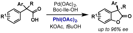 The Yu group reported an intramolecular C(sp2)–H acetoxylation that could also be rendered asymmetric using a Boc-Ile-OH chiral ligand (Scheme 7) [21]. This report was the first enantioselective application of Pd(II)/Pd(IV) catalysis and gave high yields and enantioselectivities of benzofuranones.