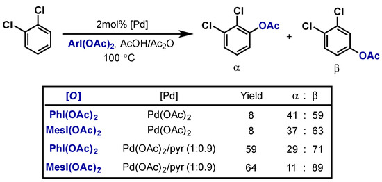 Sanford demonstrated an impressive example of non-directed C(sp2)–H acetoxylation through the addition of pyridine to enhance catalytic activity of the palladium catalyst (Scheme 8) [22]. In this system, the ratio of [Pd]/pyridine proved critical as well as the selection of hypervalent iodine oxidant. Switching to the more sterically hindered MesI(OAc)2 from PhI(OAc)2 improved both yield and regioselectivity.