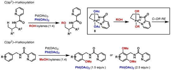 Chen reported C(sp3)–H and C(sp2)–H alkoxylation using a picolinamide directing group (Scheme 9) [23]. The reaction is proposed to proceed via displacement of acetate ligands by alkoxides at a Pd(IV) intermediate (8). The authors rule out an alternative SN2-displacement of Pd(IV) by ROH since t-BuOH also participates to give C–OR bond formation. This reactivity is divergent from their previous reports on C–H amination using this same system, where 8 would undergo selective C–N reductive elimination in the absence of an external nucleophile (for discussion of C–N bond formation, see Section 2.2.4.2, Scheme 27b). It was found that the use of other oxidants including AgOAc, Oxone, Ce(SO4)2, K2S2O8, “F+” sources, as well as hypervalent iodine oxidants with other carboxylate ligands all gave inferior conversions. In C(sp2)–H alkoxylation, either mono- or bisalkoxylation could be achieved by altering the equivalents of PhI(OAc)2.