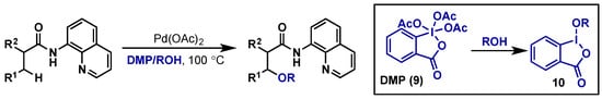 A similar transformation has also been reported by Rao using an 8-aminoquinoline directing group and the unique choice of λ5-iodane Dess-Martin Periodinane (DMP, 9) as the oxidant (Scheme 10) [24]. Other oxidants including PhI(OAc)2, PhI(OTFA)2, K2S2O8, NaIO4, NaIO3, and Selectfluor all gave little or no conversion to desired products and competing functionalization of the 8-aminoquinoline directing group was also observed. The authors propose that DMP is not the terminal oxidant but rather cyclic λ3-iodane 10, formed in situ by attack of the alcohol on DMP, which then transfers the alkoxide to the palladium center upon oxidation. However, a similar ligand displacement at a Pd(IV) intermediate, analogous to Chen’s report, cannot be ruled out.
