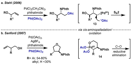There have been several reports on 1,2-aminooxygenation of alkenes via this approach that utilize phthalimide as the nitrogen source. Stahl reported the use of allylic ethers in the diastereoselective aminoalkoxylation of terminal alkenes (Scheme 12a) [25]. Mechanistic studies revealed that an initial cis aminopalladation step and oxidation gave Pd(IV) intermediate 13, followed by C–O bond formation via an intermolecular SN2-displacement by acetate. Using a similar approach, Sanford employed homoallylic alcohols in the diastereoselective formation of substituted tetrahydrofuran rings (Scheme 12b) [26]. Consistent with Stahl’s findings, Sanford reports a cis aminopalladation/oxidation sequence however, in this case, the presence of the homoallylic alcohol results in intramolecular coordination to give palladacycle 14. This leads to preferential direct C–O bond forming reductive elimination rather than intermolecular SN2 attack on 14. Consistent with the necessary formation of the six-membered palladacycle, additional substitution on the alcohol backbone results in significantly higher yields.