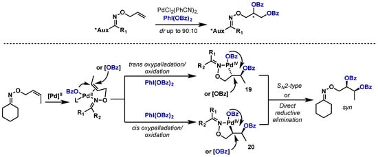 Using PhI(OBz)2 and PdCl2(PhCN)2, Sanford’s group was also able to perform asymmetric alkene dioxygenation by tethering of a chiral oxime directing group (Scheme 14) [28]. They were able to achieve moderate to high levels of diastereoselectivity on a wide range of oxime substrates possessing different chiral elements. A control experiment using both a cis and trans alkene showed that both gave rise to their respective syn dioxygenated products, shedding some light on the potential mechanism. While the exact pathway was not elucidated, they propose that an initial oxypalladation could occur in either a trans or cis fashion to give 19 or 20, each of which can converge to the syn product by either an SN2-type displacement or direct reductive elimination respectively.