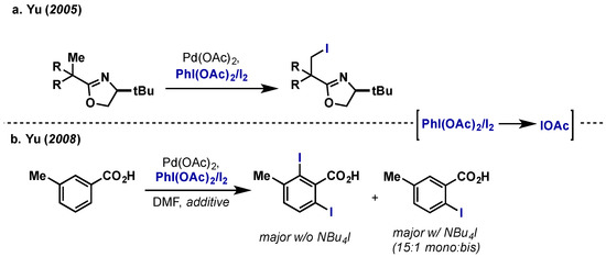 There have been several reports of C–I bond formation using the Suarez-type iodine reagent IOAc, often generated via reaction of PhI(OAc)2 and I2 in situ. Yu initially demonstrated this approach in the directed iodination of unactivated primary C(sp3)–H bonds using an oxazoline directing group (Scheme 17a) [32,33]. The use of a chiral oxazoline gave good to excellent levels of diastereoselectivity (91:9 to 99:1) in prochiral substrates. A subsequent report from Yu showed the directed α-iodination of benzoic acids under similar conditions giving rise to predominantly diiodinated products (Scheme 17b) [34]. It was found that DMF was essential for high conversion and the use of tetrabutylammonium iodide as an additive could help control mono- vs. bisiodination products. While the mechanism of Pd(II) oxidation with IOAc has not been fully elucidated, KIE indicate that C–H bond cleavage is proceeding via an electrophilic mechanism in these cases and thus a Pd(II)/Pd(IV) catalytic cycle is proposed.