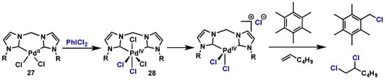 Kraft demonstrated the use of a Pd(II)-NHC complex for stoichiometric dichlorination of linear alkenes and monochlorination of benzylic C–H bonds (Scheme 18) [35]. PhICl2 oxidizes Pd(II) species 27 to Pd(IV) (28), and subsequent loss of chloride generates a cationic, pentacoordinated Pd(IV) species that is active for C–H chlorination.