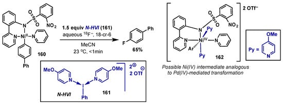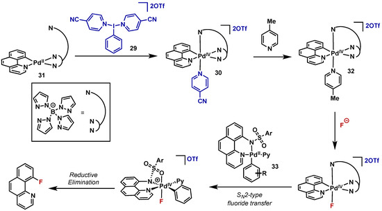 Direct C–H fluorination is challenging for transition metal catalysis due to the low reactivity of metal-fluorine bonds towards reductive elimination. Several attempts have been made using Pd(II)/Pd(IV) catalysis, however the use of hypervalent iodine oxidants has been met with challenges. This is due to the high reactivity of the most common λ3-iodane X-ligands, namely acetates or halogens, to undergo competitive reductive elimination. In this area, Ritter has been successful in the radiofluorination of C(sp2)–H bonds using stoichiometric Pd(II) complexes as fluorinating agents and a (poly)cationic λ3-iodane (29) as the oxidant (Scheme 19) [36]. These (poly)cationic λ3-iodane reagents are relatively underutilized in the synthetic literature, however Dutton has also used these complexes to study high valent palladium and platinum complexes and this work is discussed in Section 2.1. Ritter’s report is an extension of his prior work which utilized the “F+” source Selectfluor in the two step fluorination of arylboronic acids with a similar complex, however the use of electrophilic fluorinating agents are not readily translatable to radiolabeling applications [37]. They therefore designed a system employing a highly electrophilic Pd(IV) complex (30), could then undergo ligand exchange with a source of nucleophilic 18F−. Pd(IV) complex 30 was accessed via oxidation of 31 with (poly)cationic λ3-iodane 29; the key feature of this oxidant is the donation of a labile heterocyclic ligand which can undergo facile ligand exchange, first with 4-picoline to give 32, and subsequently with fluoride upon exposure to a nucleophilic 18F-source in the reaction conditions. This complex then serves as a highly electrophilic source of 18F for a second Pd(II) species (33) which then undergoes C–F bond reductive elimination to give desired product. In a later report they also report the use of an analogous nickel-mediated process under similar conditions (see Section 5.2).