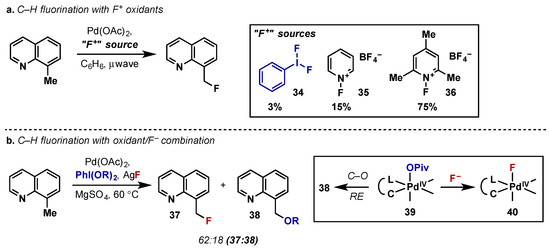 Complimentary approaches to C–H fluorination with Pd(II)/Pd(IV) catalysis via (a) electrophilic fluorine sources and (b) nucleophilic fluorine sources.