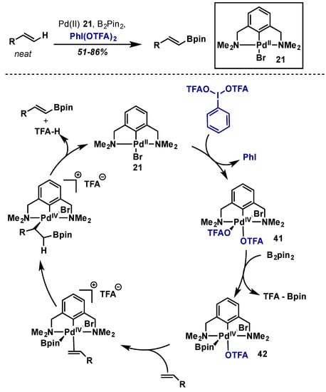 The selective C–H borylation of alkenes under oxidative conditions was reported by Szabo in 2010, giving rise to valuable alkenyl boronates (Scheme 21) [41]. Using an NCN-pincer Pd(II) catalyst (21), PhI(OTFA)2 as an oxidant, and B2pin2, the borylation of simple alkenes could be accomplished in good yield. It is noted that a particular advantage of this method is that the oxidizing conditions produce TFAO-BPin upon transmetallation rather than borohydrides, which avoids competitive hydroboration of the resultant alkene products. While the authors could not fully elucidate the mechanism of this process, they propose that initial oxidation of catalyst 21 generates a highly electrophilic Pd(IV) species 41 which then undergoes facile transmetallation with B2pin2 to give 42. Alkene coordination, insertion, and finally elimination and decomplexation give the desired products and regenerate 21. The method is limited by the need to use solvent quantities of the alkene, and internal alkenes react very poorly.